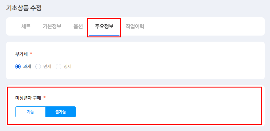 ② [주요정보] 탭의 '미성년자 구매'를 [불가능]으로 수정 합니다.