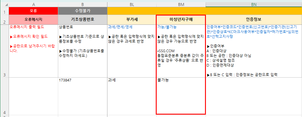 ② 엑셀 파일 내 [미성년자구매]를 [불가능]으로 수정 후 엑셀 저장 합니다.