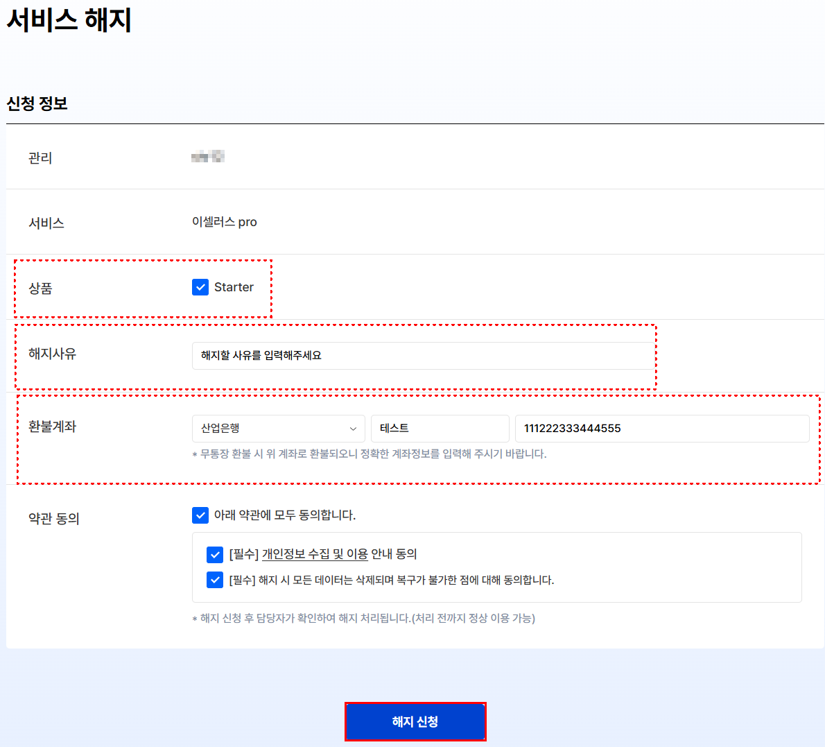 서비스 정보 확인 및 [해지사유], [환불계좌] 입력 후 해지신청 선택합니다.