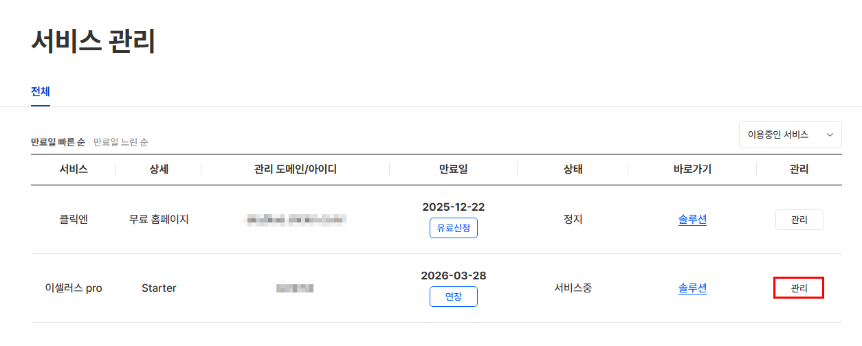 [이용중인 서비스] 확인 후 [관리]를 선택합니다.
