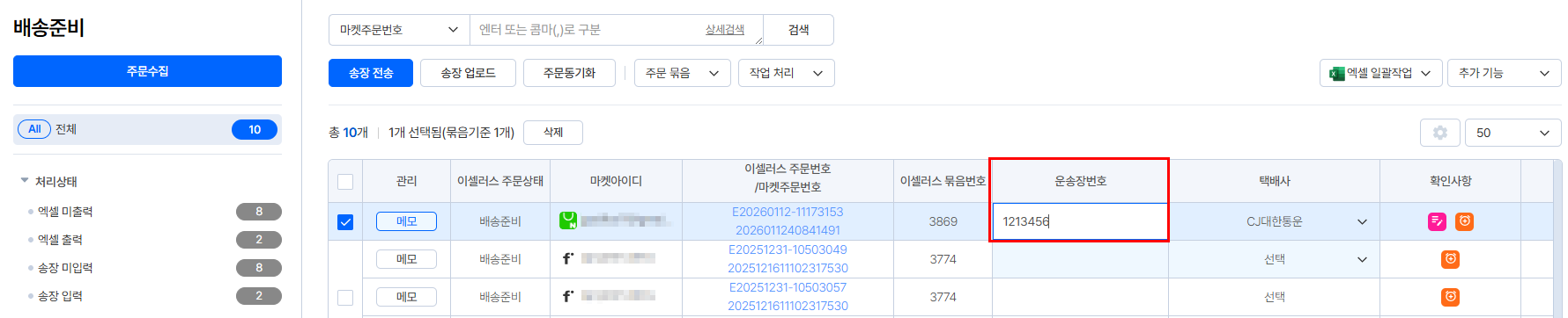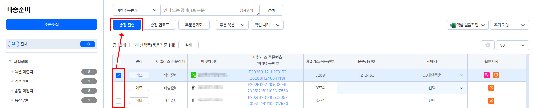 마켓주문번호, 택배사, 송장번호를 입력한 항목을 선택하시면 됩니다.