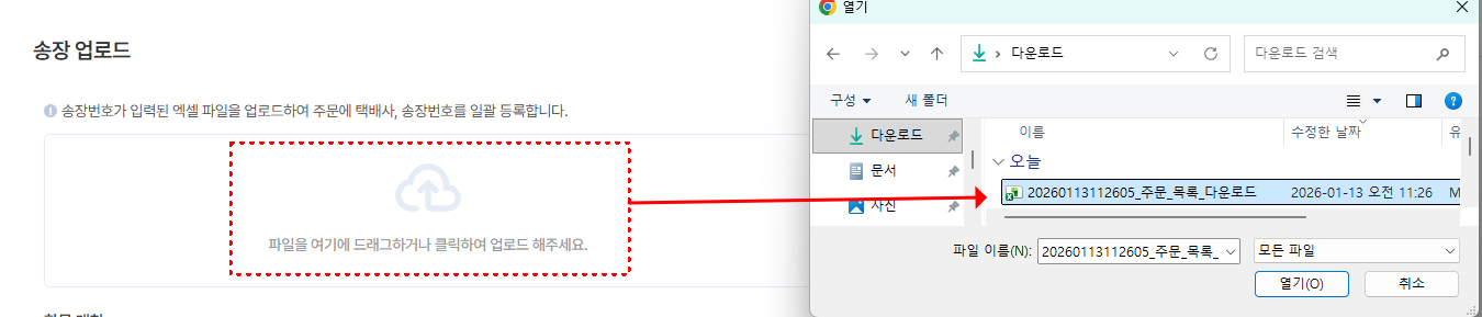 ③ 업로드 팝업에서 엑셀파일을 불러옵니다.