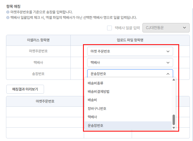 단, [마켓주문번호]와 [송장번호]는 반드시 입력되어 있어야 합니다.