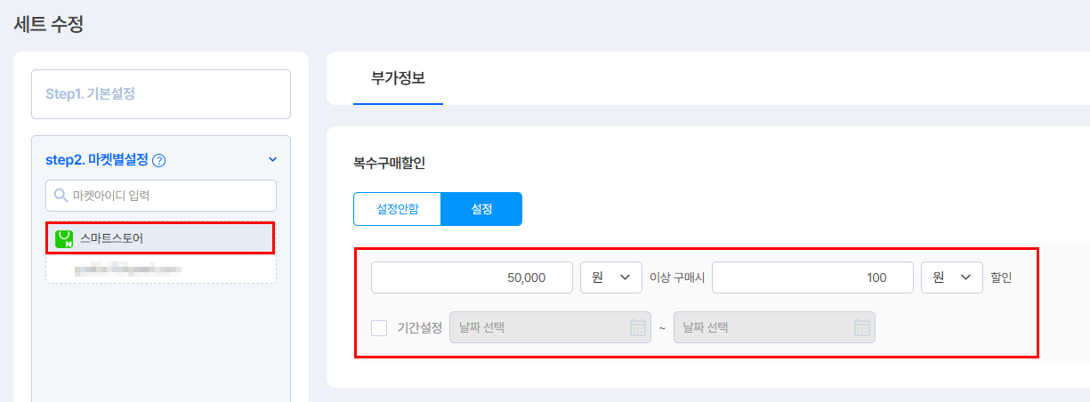 ③ 스마트스토어 선택 - [부가정보] - [복수구매할인] 항목의 기준 금액을 판매가 보다 높게 수정합니다.
