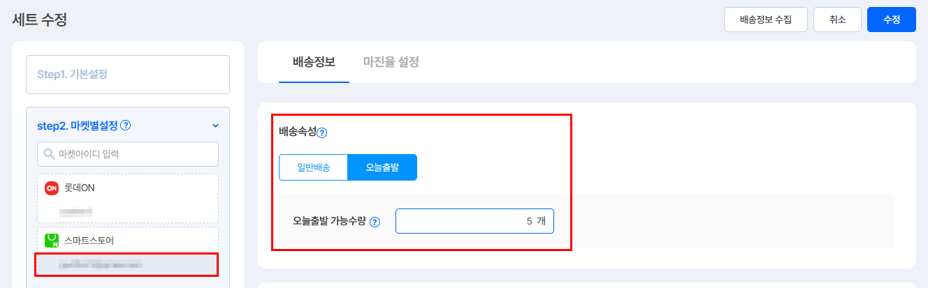 ③ [스마트스토어 마켓아이디] 선택 - [배송정보] - [배송속성] 내 오늘출발 가능수량을 재고수량보다 작게 수정합니다.