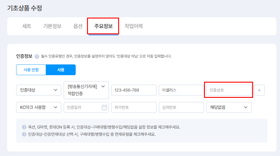 ② [주요정보] 탭의 '인증정보'에 [인증상호] 입력합니다.