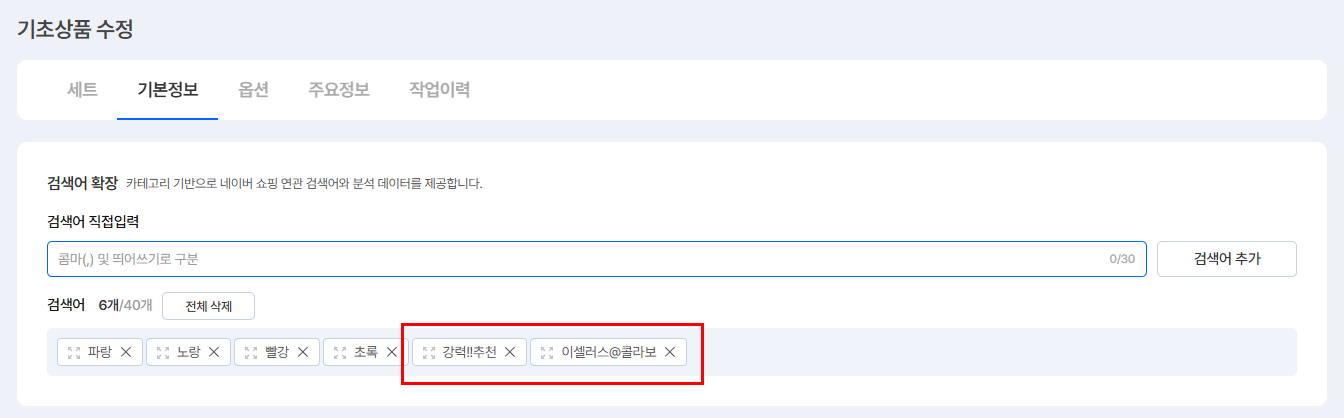 ② [기본정보] 탭의 '검색어' 중, 특수문자가 포함된 검색어 제거합니다.