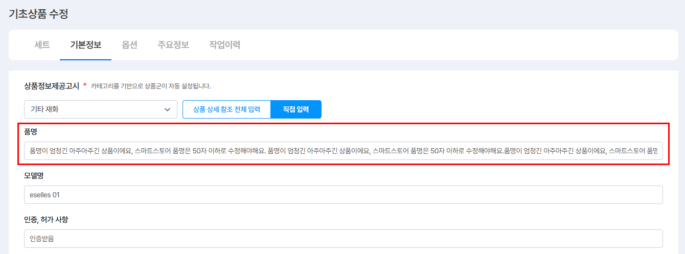 ② [기본정보] 탭의 '상품정보제공고시'의 세부 입력 값을 50자 미만으로 수정합니다.