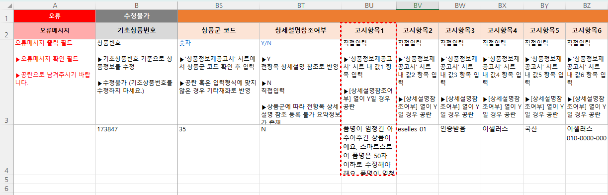 ② 엑셀 파일 내 고시항목1~23 내 50자가 넘는 값을 50자 미만으로 수정 후 엑셀 저장합니다.