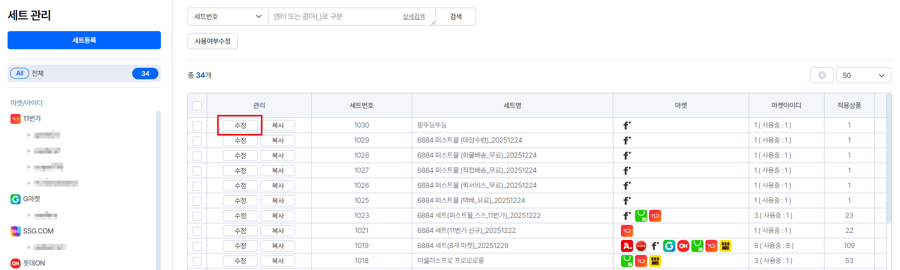 ④ 우측 상단 [수정] 선택하여 세트 수정 합니다.
