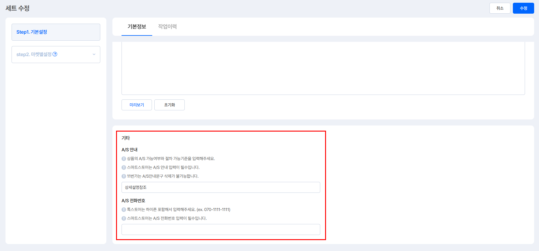③ [기본정보] - 하단 [기타] - [A/S 안내] 및 [A/S 전화번호] 입력 부탁드립니다.