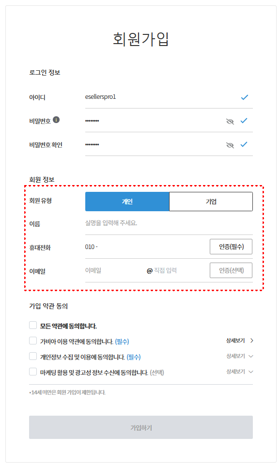 회원유형 선택 후 정보 입력합니다.