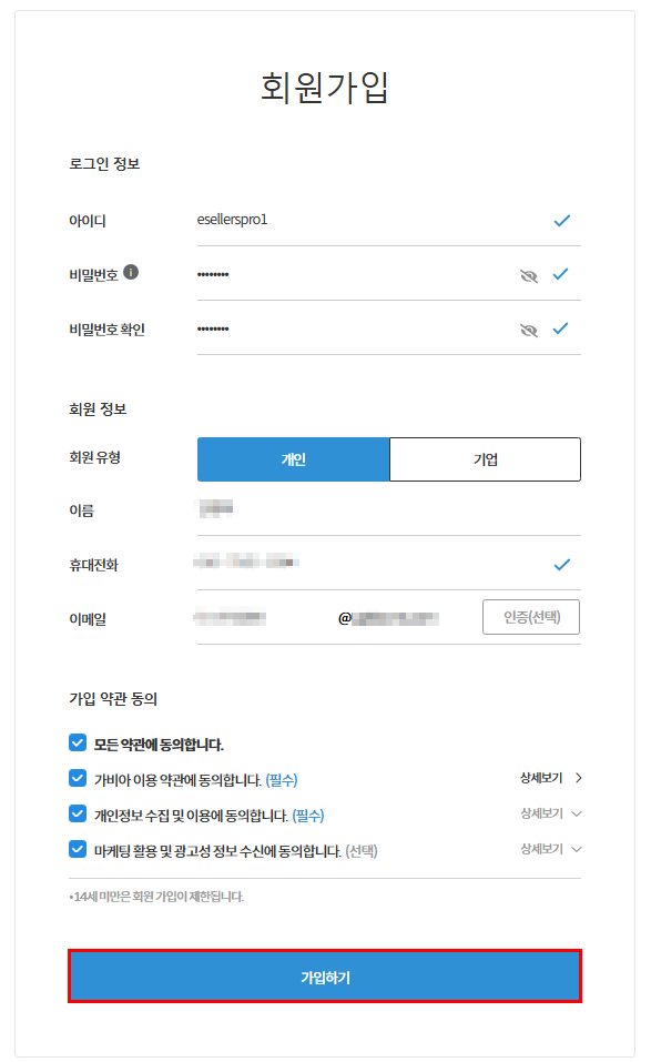가입 약관 동의 체크합니다.