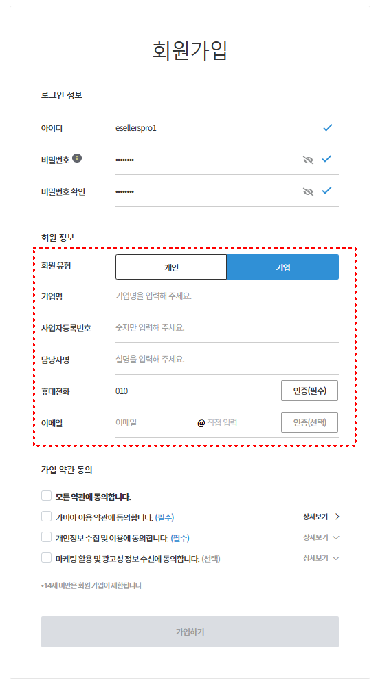 기업명, 사업자등록번호, 담당자명, 휴대전화 인증(필수), 이메일 작성합니다.