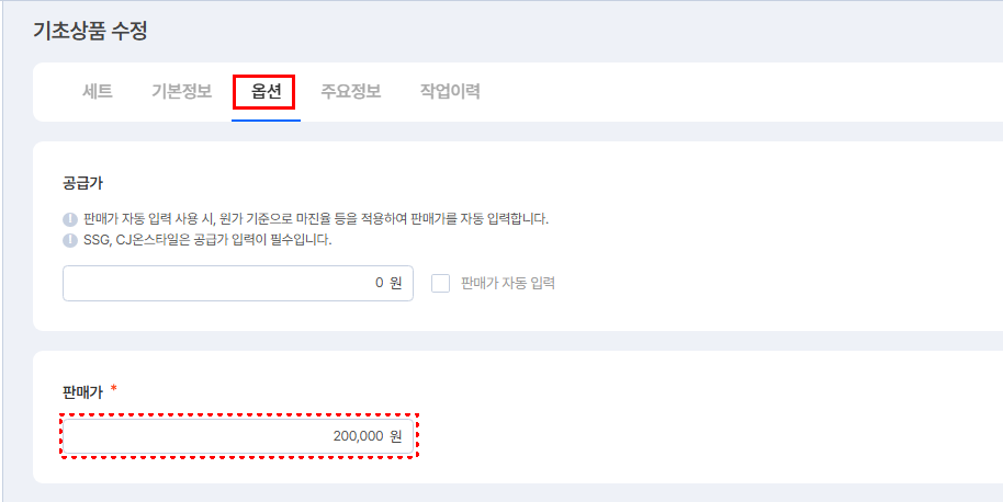 ② [옵션] 탭의 '판매가'를 수정합니다.
