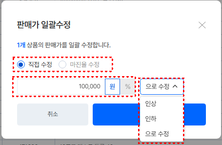 금액 인상, 인하, 고정값 선택 가능