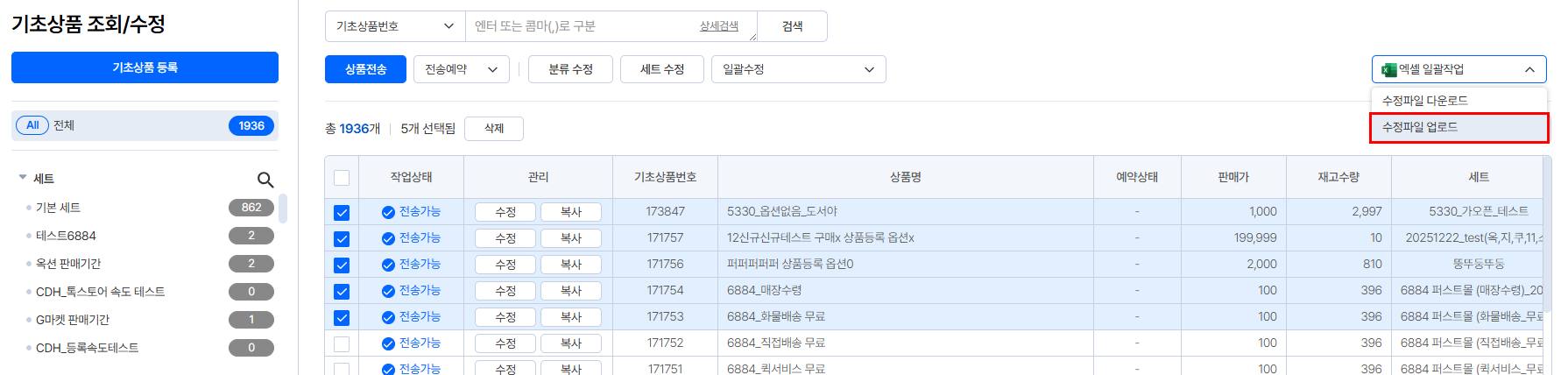 ③ [엑셀 일괄작업] - [수정파일 업로드] 선택합니다.