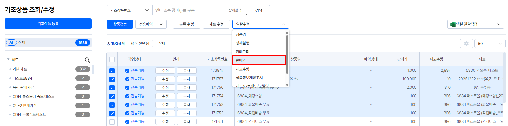 ① 수정할 상품 체크 - [일괄수정] - [판매가] 선택합니다.