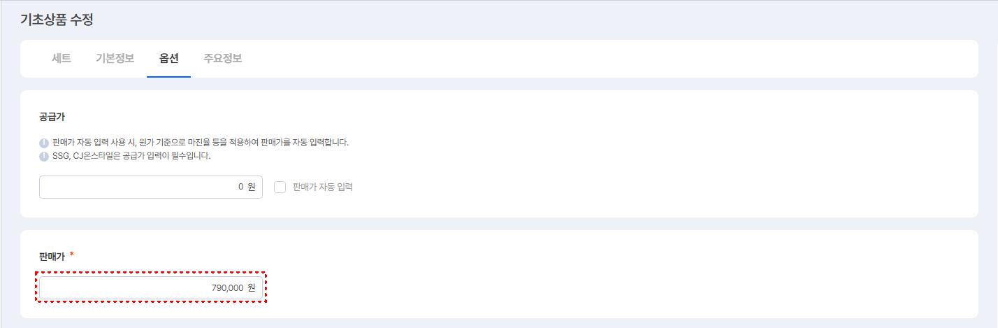 ② [기본정보] 탭의 '상품명' 혹은 '카테고리'를 수정하거나 [옵션] 탭의 '판매가'를 수정합니다.