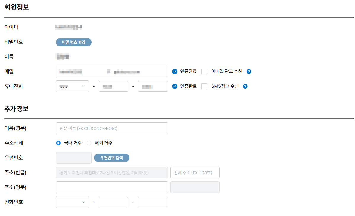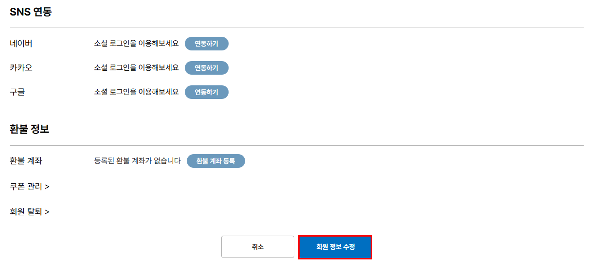 6. 회원정보 중 변경이 필요한 내용을 입력하고 [회원 정보 수정]을 클릭합니다.